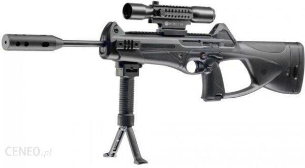 Wiatrówka ta to pneumatyczna wersja najnowszego karabinka szturmowego Beretta CX4 STORM.Karabinek ten zasilany jest 88 gramową kapsułą z gazem CO-2. Dzięki tej kapsule możemy wystrzelić ok. 350 sztuk śrutu bez ładowania.W magazynek możemy załadować aż 30 szt śrutów w kal. 4,5 typu diabolo czyli śrut płaski, szpic lub grzybek. Możemy strzelać z niego także kulkami ołowianymi również w kal. 4,5mmJedyna oryginalna, pneumatyczna wersja najnowszego karabinka szturmowego Beretta Cx4 Storm. Karabinek ten powstał przy ścisłej współpracy koncernów Umarex oraz Beretta.Zestaw XT zawiera:- dwójnóg QSB typu „Grip-Pod” Uchwyt w wysuwanym/chowanym dwójnogiem. Zamontowany do potrójnej szyny picantinny 22mm- tłumik- celownik optyczny 4×32 Beretta Tri-Tac z potrójna szyną picantinny 22mm. Celownik 4×32 z oryginalnym logo Beretta z krzyżem celowniczym MilDot (4-punktowy), skalowane pokrętła, pojedynczy montaż 22mm.Wiatrówka ta posiada gwintowaną lufę, regulowane w pionie i w poziomie przeziernikowe przyrządy celownicze, bardzo trwałą, polimerową kolbę oraz w komplecie praktyczną i funkcjonalną walizkę w której karabinek może bezpiecznie podróżować.Beretta TrademarkOto karabinek pneumatyczny będący wierną repliką najnowszego karabinka szturmowego Beretta Cx4 Storm. Jest to jeden z najnowszych modeli niemieckiej firmy Umarex, która słynie jako najlepszy na świecie producent replik broni palnej, zasilanych sprężonym gazem CO2. Sprzęt jest w komplecie z praktyczną i funkcjonalną walizką z czarnego kompozytu, w której karabinek może bezpiecznie podróżować.Karabinek ten powstał przy ścisłej współpracy koncernów Umarex oraz Beretta jest on także zasilany kapsułą CO2 o gramaturze 88g.ZasilanieZastosowanie 88 gramowej kapsuły z gazem CO2 jest doskonałym rozwiązaniem. Pozwala na oddanie ponad 300 równych strzałów! Nie trzeba zbyt często wymieniać kapsuły a jeśli już się skończy wymiana jej jest bardzo łatwa i szybka:- wystarczy zdjąć stopkę kolby naciskając na boczne zatrzaski- wykręcić starą kapsułę (resztki gazu mogą ulecieć)- wkręcić nową kapsułę CO2- założyć stopkę i zatrzasnąćStanowisko strzeleckieGdy kapsuła jest już założona trzeba wziąć się za ładowanie magazynka śrutem, lecz zanim to zrobimy trzeba upewnić się, że mamy przygotowane bezpieczne stanowisko strzeleckie. Na linii strzału i w bezpośrednim sąsiedztwie nie mogą znajdować się osoby, zwierzęta i przedmioty ani nie mogą znaleźć się w trakcie strzelania. Bezpieczeństwo jest najważniejsze gdyż wiatrówką także można zrobić krzywdę, więc najpierw zatroszcz się o bezpieczne miejsce do strzelania a potem przygotuj wiatrówkę do strzelania – nigdy odwrotnie.MagazynekWięc jeśli mamy już przygotowane stanowisko strzeleckie można załadować magazynek – tutaj mamy do czynienia z rewolucyjnym, jedynym w swoim rodzaju rozwiązaniem! Magazynek mieści aż 30 śrutów! Jego konstrukcja umożliwia bardzo szybkie oddawanie kolejnych strzałów, czyli dużą szybkostrzelność, przy jednoczesnym wykluczeniu zacięć. Do tej pory nie było wiatrówki, która dysponowała możliwością wystrzelenia takiego gradu pocisków w ciągu kilkunastu sekund! Aby obejrzeć i załadować to cudo trzeba nacisnąć przycisk na rekojeści i wyciągnąć magazynek z chwytu. Elastyczna taśma którą widzimy umocowana jest na rolkach, taśma porusza sie tak jak gąsienice w czołgu. Do każdej komory w taśmie należy załadować śrucinę w kalibrze 4,5mm. Ważne aby śrut nie wystawał z tyłu, ani z przodu. Po załadowaniu każdej z komór trzeba wsunąć magazynek do rękojeści zwracając uwagę, aby jedna z komór była ustawiona idealnie na wprost, na samym czubku magazynka.Przygotowanie do pierwszego strzałuPo załadowaniu magazynka i upewnieniu się o możliwości oddania strzału trzeba jeszcze odbezpieczyć i przeładować karabinek, przy pomocy dźwigni znajdującej się po prawej stronie karabinka. Przeładowanie wykonuje się tylko raz, po załadowaniu magazynka. Bezpiecznik przetykowy naciska się z lewej strony aby zabezpieczyć karabinek i z prawej strony aby go odbezpieczyć. Dodatkowo widoczna czerwona obwódka sygnalizuje odbezpieczenie karabinka.StrzelanieTeraz za każdym naciśnięciem spustu pada strzał i z gwintowanej lufy ku celowi mknie śrut z prędkością dochodzącą do 190 m/s. Mechanizm spustowy działa w systemie półautomatycznym czyli Semi-Auto. Dlatego do ściągnięcia języka spustowego nie potrzeba dużej siły i droga spustu jest krótka. Nie ma potrzeby napinania kurka i nie występuje ciężka praca spustu, który musi pokonać opór mechanizmu kurkowego.Podczas strzału na ułamek sekundy odsuwa się atrapa okienka wyrzutu łusek – tak jak w oryginale – jest to dodatkowa cecha mająca zbliżyć sposób działania do oryginalnej wersji.Przygotowanie do pierwszego strzałuPo załadowaniu magazynka i upewnieniu się o możliwości oddania strzału trzeba jeszcze odbezpieczyć i przeładować karabinek przy pomocy dźwigni znajdującej się po prawej stronie karabinka. Przeładowanie wykonuje się tylko raz, po załadowaniu magazynka. Bezpiecznik przetykowy wciska się z lewej strony aby zabezpieczyć karabinek lub z prawej, aby go odbezpieczyć. Dodatkowo widoczna czerwona obwódka sygnalizuje odbezpieczenie karabinka.StrzelanieTeraz za każdym naciśnięciem spustu pada strzał i z gwintowanej lufy ku celowi mknie śrut z prędkością dochodzącą do 190 m/s. Mechanizm spustowy działa w systemie półautomatycznym czyli Semi-Auto. Dlatego do ściągnięcia języka spustowego nie potrzeba dużej siły a droga spustu jest wyjątkowo krótka.Podczas strzału na ułamek sekundy odsuwa się atrapa okienka wyrzutu łusek – tak jak w oryginale – jest to dodatkowa cecha mająca zbliżyć sposób działania do oryginalnej wersji.CelowaniePrzyrządy celownicze ustawione są fa