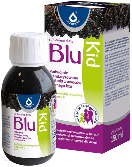BLUKID 150 mlBlu Kid to wyjątkowa kompozycja zawierająca podwójnie standaryzowany na zawartość polifenoli i antocyjanów ekstrakt z owoców czarnego bzu*, sok z owoców czarnego bzu, witaminę C, cynk i bioflawonoidy cytrusowe.Czarny bez wspiera prawidłowe funkcjonowanie układu odpornościowego, ma właściwości antyoksydacyjne oraz dostarcza polifenoli i antocyjanów.Blu Kid charakteryzuje się wysoką zawartością witaminy C i cynku, które pomagają w ochronie komórek przed stresem oksydacyjnym i pomagają w prawidłowym funkcjonowaniu układu odpornościowego. Ponadto cynk przyczynia się do utrzymania prawidłowego metabolizmu makroskładników odżywczych, a witamina C przyczynia się do zmniejszenia uczucia zmęczenia i znużenia oraz pomaga w prawidłowej produkcji kolagenu w celu zapewnienia prawidłowego funkcjonowania naczyń krwionośnych.