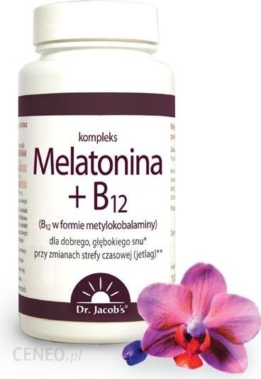Właściwości:Dla głębokiego, regenerującego snu, przy zaburzeniach snu, nadmiernym stresie. Melatonina + B12 to produkt stworzony dla osób, które mają problemy z zasypianiem oraz słabą jakością snu – sen płytki, z dużą ilością snów, z wybudzeniami, nie przynoszący odpoczynku (poranne zmęczenie). /br> Dolegliwość taka może być okresowa (z powodu stresującej sytuacji życiowej, pełni księżyca, zaburzenia rytmu dobowego, itp.) lub chroniczna. W takich przypadkach wystarczy jedna tabletka dziennie na 1-2 godziny przed planowanym snem. /br> Tabletki Melatonina + B12 polecane są także osobom podróżującym, w szczególności zmieniającym podczas podróży strefę czasową. Dotyczy to szczególnie podróży do dalekich krajów, gdzie przestawienie się na miejscowy czas zajmuje niekiedy nawet tydzień. Może to skutecznie popsuć urlop lub kilkudniowy wyjazd do pracy. /br> W przypadku zaburzeń snu spowodowanych wyjazdem, powinna wystarczyć połówka tabletki spożyta na 1-2 godziny przed planowanym snem i przyjmowana przez pierwsze 5 dni wyjazdu. /br> Jedna tabletka Melatonina + B12 zawiera: /br> – 1 mg melatoniny,/br> – 2,5?µg witaminy B12, czyli 100% jej dziennego zapotrzebowania. /br>/br> Witamina B12 jest także istotnym składnikiem aktywnym produktu. B12 jest ważna dla prawidłowego funkcjonowania układu nerwowego oraz funkcji psychologicznych. Pomaga w prawidłowym funkcjonowaniu układu odpornościowego. Przyczynia się do utrzymania prawidłowego metabolizmu energetycznego, a poprzez to do zmniejszenia uczucia zmęczenia oraz znużenia. Dlatego świetnie współgra z melatoniną w osiąganiu zdrowego, regenerującego snuSkładniki:Substancja słodząca ksylitol, naturalny aromat wiśniowy, masa tabletkowa: celuloza mikrokrystaliczna i celuloza zagęszczona, sproszkowany sok z buraków, melatonina, metylkobalamina (witamina B12)1 tabletka zawiera: Melatonina 1mgWitamina B12 2,5µg, 100% RWS* RWS – Referencyjna Wartość SpożyciaSposób użycia:1 tabletka dziennie popita pół szklanki płynu na 1-2 godziny przed planowanym snem. Produkt dla osób powyżej 10 roku życiaOpakowanie: 60 tabletek