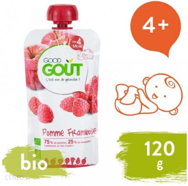 Good Gout BIO Jabłko z maliną 120 gZ dumą przedstawiamy naszą malinę z jabłkiem. Rozkosznie malinowe policzki są po prostu kochane! Złączyliśmy je ze słodką odmianą jabłek Gala. Są dokładnie skomponowane, by świetnie do siebie pasowały! I są przepyszne!Produkt dla dzieci od ukończenia 4. miesiąca życia. Pokarm owocowy do specjalnego żywienia niemowląt i małych dzieci. Pasteryzowany. Poddany obróbce cieplnej.