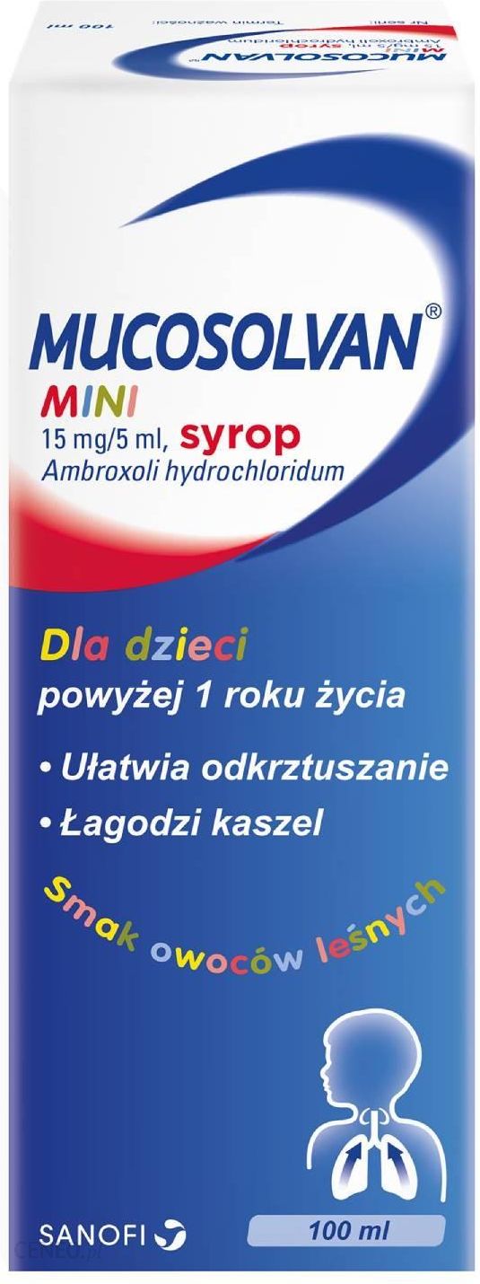 Mucosolvan® MINI, 15 mg/5 ml, syrop. 5 ml syropu zawiera 15 mg ambroksolu chlorowodorku (Ambroxoli hydrochloridum). Wskazania do stosowania: Ostre i przewlekłe choroby płuc i oskrzeli przebiegające z zaburzeniem wydzielania śluzu oraz utrudnieniem jego transportu. Przeciwwskazania: Nadwrażliwość na ambroksolu chlorowodorek lub na którąkolwiek substancję pomocniczą. {ChPL 05/2017}. Podmiot odpowiedzialny: Sanofi-Aventis Sp. z o.o.