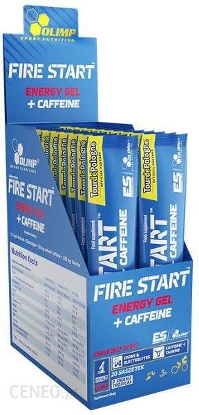 FIRE START™ – ZASTRZYK ENERGII DLA TWOJEGO ORGANIZMU!Opracowując koncepcję stworzenia żeli energetycznych nasi specjaliści przebadali sportowców, by uzyskać odpowiedzi na podstawowe kwestie: jakie kryteria powinien spełnić produkt, który z jednej strony ma umożliwić osiągnięcie wymarzonego rezultatu, a z drugiej strony jest jedyną przekąską w czasie długotrwałego wysiłku fizycznego.FIRE START ENERGY GEL + CAFFEINE jest efektem prac nad zaspokojeniem tych oczekiwań!Konsystencja – kluczowa z punktu widzenia sportowca wykonującego ciężki wysiłek fizyczny. Zadbaliśmy o to, by nasze żele były możliwie najłatwiejsze do przełknięcia i nie osadzały się w jamie ustnej skutkując poczuciem nieprzyjemnej lepkości. Efekt? Już kilka sekund po przełknięciu Fire Start w Twoich ustach nie będzie po nim żadnego śladu!Smak – mając pewność, że spożycie żelu w trakcie długotrwałego wysiłku jest bezpieczne i pożądane, a w niektórych przypadkach niezbędne, dołożyliśmy wszelkich starań, by jego smak był możliwie jak najlepszy. Świetnie zdajemy sobie sprawę, że długa aktywność fizyczna i utrzymujący się stan zmęczenia to okoliczności, w których zjedzenie czegoś smacznego nabiera specjalnego wymiaru nagrody. Efekt który uzyskaliśmy sprawi, że z wytęsknieniem będziesz czekał na moment w którym przewidziałeś spożycie żelu. Gwarantujemy – będzie to dla Ciebie prawdziwa przyjemność!Dodatki – podstawowym zadaniem żelu jest dostarczenie energii w trakcie wysiłku. Po opracowaniu najlepszej formuły realizującej ten cel, zadaliśmy sobie pytanie jakiego dodatkowego wsparcia moglibyśmy jeszcze udzielić. Postawiliśmy na dwa składniki odpowiadające na najbardziej kluczowe potrzeby. Jednym z tych produktów jest żel z kofeiną.Kofeina – ma działanie pobudzające, zmniejsza uczucie zmęczenia fizycznego i psychicznego, poprawia również funkcjonowanie układu nerwowego. Dzięki niej, podwójnie odczujesz przypływ energii płynącej z naszych żeli.WĘGLOWODANY: Organizm w trakcie intensywnego wysiłku fizycznego potrzebuje doskonale przyswajalnej energii, aby mógł pracować ze 100% wydajnością i być w stanie sprostać dużym obciążeniom treningowym. Źródłem tej energii są przede wszystkim węglowodany, a konkretnie glukoza, która magazynowana jest w formie glikogenu mięśniowego i wykorzystywana przy intensywnych wysiłkach trwających kilkadziesiąt minut lub glikogenu wątrobowego, który uwalnia ją, gdy wysiłek o umiarkowanej intensywności jest długotrwały. Aby utrzymać optymalną wydajność treningową podczas długotrwałego wysiłku o niskiej lub umiarkowanej intensywności, należy uzupełniać ubytek węglowodanów zużywanych w procesach biochemicznych (utlenianie) jako paliwo energetyczne. Żele sportowe są doskonałym źródłem takiej energii.Uzupełnienie niedoborów węglowodanów w organizmie jest ściśle skorelowane z szybkością ich wchłaniania w jelitach. Stąd znaczenie ma odpowiedni stosunek zawartych w żelu maltodekstryn i fruktozy. Jak pokazują badania, szybkość utleniania węglowodanów w jelitach przy długotrwałym wysiłku wynosi 90g/min. Aby nie doszło do nadmiernego wysycenia jelitowych transporterów węglowodanowych, a co za tym idzie do nagromadzenia się węglowodanów w jelitach, co niewątpliwie obniży szybkość przyswajania ich przez organizm i spowoduje późniejsze „problemy żołądkowe”, stosuje się odpowiednią proporcję w podaży maltodekstryn do fruktozy, który wynosi 2:1. Dzięki temu oba rodzaje węglowodanów, wykorzystujących różne transportery jelitowe mogą być wchłaniane w tym samym czasie , zapewniając optymalne uzupełnienie energii podczas wysiłku. Dodatek fruktozy do glukozy wpływa również na prędkość opróżniania żołądka podczas wysiłku, a to powoduje szybsze dostarczenie wody (nawodnienie), mniejsze problemy trawienne i w konsekwencji lepsze wyniki osiągane podczas treningu czy zawodów. Optymalny stosunek maltodekstryn/fruktoza wynoszący 2:1, wpływając na szybkość absorbcji węglowodanów, powoduje zwiększenie możliwości odtwarzania energetycznych stanów magazynowych, co ma niebagatelne znaczenie podczas kolejnych, następujących po sobie wysiłków.Jedna porcja żelu, czyli 23 g węglowodanów, pochodzących zarówno od glukozy jak i fruktozy, stanowi doskonałe, skoncentrowane źródło energii dla osób aktywnych fizycznie w trakcie przedłużających się wysiłków.Ryc. 1. Schemat działania transporterów dla glukozy i fruktozy.EKSTRAKT Z GUARANY: Ziarna guarany zawierają w swoim składzie ksantyny (kofeina, katechina i procyjanidyny). Ilość kofeiny w guaranie jest większa niż w samej kawie, stąd jej popularność jako substancji pobudzającej. Kofeina zawarta w guaranie w skuteczny sposób znosi uczucie zmęczenia fizycznego, jak i psychicznego, a także poprawia funkcjonowanie naszego układu nerwowego, co objawia się lepszą koncentracją czy zapamiętywaniem.Dystans przebiegany w 10 min. odstępach czasu podczas symulowanego meczu piłki nożnej obserwowany dla grupy suplementującej kofeinę (3 mg/kg masy ciała; kolor złoty) i bez suplementacji (kolor niebieski).Zaadoptowano z Del Coso J et al. Effects of a Caffeine-Containing Energy Drink on Simulated Soccer Performance. PLoS ONE 7(2): e31380, 2012.MAGNEZ warunkuje dostarczanie energii do mięśni (ma znaczny udział w procesach syntezy i rozpadu związków wysokoenergetycznych), zapobiega bolesnym skurczomSÓD reguluje gospodarkę wodną; umożliwia prawidłowe przesyłanie impulsów nerwowych, umożliwia transport zarówno białek, jak i węglowodanów do wszystkich tkanek ciała, bierze udział w utrzymywaniu właściwej regulacji kwasowo-zasadowej.POTAS zapewnia prawidłową gospodarkę wodno-elektrolitową organizmu, bierze udział w generowaniu impulsów nerwowych (niedobór negatywnie wpływa na kurczliwość mięśni