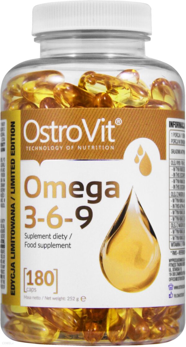 OstroVit Omega 3-6-9Suplement diety OstroVit zawiera kwasy tłuszczowe omega 3 (EPA, DHA, ALA), Omega 6 (LA) i Omega 9 (OA), wzbogacone o witaminę E. Kwasy omega 3, omega 6 oraz omega 9 zaliczane są do niezbędnych nienasyconych kwasów tłuszczowych. Preparat zaleca się wszystkim osobom, które chcą uzupełnić codzienną dietę w powyższe substancje.Składniki:Olej rybi, olej z nasion lnu, olej z nasion słonecznika, żelatyna, substancja utrzymująca wilgoć – glicerol; woda; octan DL-alfa-tokoferylu (wit. E).1 kapsułka zawiera: Olej rybi – 400 mg** w tym kwas eikozapentaenowy (EPA) – 72 mg, w tym kwas dokozaheksaenowy (DHA) – 48 mg**, Olej z nasion lnu – 300 mg** w tym kwas alfa-linolenowy ALA – 150 mg**, w tym kwas linolowy LA – 45 mg**, w tym kwas oleinowy OA – 60 mg**, Olej z nasion słonecznika – 290 mg**, w tym kwas linolowy LA – 145 mg**, w tym kwas oleinowy OA – 43,5 mg**, Witamina E – 10,5 mg (88%)*.*RWS – Referencyja Wartość Spożycia.**RWS – Nie ustalone.Właściwości:Kwasy tłuszczowe omega-3 są niezbędne zachowania optymalnego samopoczucia i stanu zdrowia. Dostarczają one cenny kwas eikozapentaenowy (EPA) i kwas dokozaheksaenowy (DHA), które są najczęściej promowane w kierunku wsparcia prawidłowej pracy serca. Omega-3 normalizuje i reguluje poziom cholesterolu. Korzystnie wpływa na serce, mózg i naczynia krwionośne. Dodatkowo wpływa na kondycję umysłową, zdolność uczenia się, zapamiętywania i koncentracji. Kwasy omega 6 biorą udział w produkcji wielu hormonów, w tym neuroprzekaźników, pomaga usprawnić pracę centralnego układu nerwowego i wspierają odporność. Kwasy omega 9 obniżają poziom cholesterolu całkowitego i złego (LDL), nie obniżając jednocześnie dobrego (HDL). Są budulcem każdej komórki, pomagają zachować prawidłowe ciśnienie krwi.Zalecane dzienne spożycie:1 kapsułka dziennie, najlepiej po posiłku.Przeciwwskazania:Nie spożywać w przypadku uczulenia na którykolwiek ze składników produktu. Produkt nie powinien być stosowany przez dzieci, kobiety w ciąży i matki karmiące.Przechowywanie:Przechowywać w temperaturze pokojowej w sposób niedostępny dla małych dzieci. Chronić przed wilgocią.Ważne informacje:Nie należy przekraczać zalecanej porcji do spożycia w ciągu dnia. Suplement diety nie może być stosowany jako substytut (zamiennik) zróżnicowanej diety ani aktywnego trybu życia. Utrzymanie prawidłowego stanu zdrowia wymaga zrównoważonego i zróżnicowanego odżywiania i prowadzenia zdrowego trybu życia. Istnieje wiele czynników ryzyka choroby. Zmiana jednego z tych czynników ryzyka może wywierać korzystny wpływ lub nie wywierać go.
