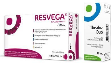RESVEGAWskazania:Resvega to suplement diety, ktry z uwagi na zawarto witamin i skadnikw mineralnych o waciwociach antyoksydacyjnych, luteiny, zeaksantyny, niezbdnych kwasw tuszczowych Omega-3 oraz resweratrolu polecany jest do stosowania przez osoby, ktre chc utrzyma prawidowe funkcje wzroku. Preparat wykazuje rwnie korzystny wpyw na waciwe funkcjonowanie ukadu sercowo-naczyniowego.Waciwoci:Suplement diety Resvega bazuje na dziaaniu witamin i skadnikw mineralnych o dziaaniu antyoksydacyjnym jak i na luteinie, zeaksantynie, niezbdnych kwasach tuszczowych Omega-3 oraz resweratrolu. Witamina E, witamina C, cynk oraz mied chroni struktury komrkowe przez szkodliwym dziaaniem wolnych rodnikw i uszkodzeniem oksydacyjnym. Cynk dodatkowo wspomaga prawidowe widzenie. Luteina i zeaksantyna to dwa te pigmenty, ktre wystpuj w siatkwce oka czowieka, gdzie chroni j przed promieniowaniem UV. Wykazuj one waciwoci przeciwutleniajce, dziki ktrym zalczaj wolne rodniki powstae pod wpywem promieniowania ultrafioletowego. Zawarte w suplemencie diety Resvega niezbdne kwasy tuszczowe – kwas dokozaheksaenowy (DHA) oraz kwas eikozapentaenowy (EPA) odpowiadaj za prawidow budow bon komrkowych i struktur tkanki nerwowej, m.in. mzgu i oczu. Chroni te ukad krenia przez regulacj gospodarki lipidowej, rozrzedzaj krew przeciwdziaajc zakrzepom. S niezbdne dla prawidowego rozwoju mzgu i oczu dziecka. Wykazuj te dziaanie antynowotworowe. DHA przyczynia si do utrzymania prawidowego widzenia, a korzystny efekt uzyskuje si przy dziennym pobraniu 250 mg DHA. Resweratrol natomiast wykazuje pozytywny wpyw przede wszystkim na ukad krenia. Hamuje agregacj pytek krwi przeciwdziaajc zakrzepom oraz obnia wchanianie zego cholesterolu LDL w ciany naczy krwiononych. W ten sposb redukuje ryzyko miadycy, a take innych chorb ukadu sercowo-naczyniowego. Jest silnym, antyoksydantem.Skadniki:olej rybi (zawierajcy niezbdne kwasy tuszczowe Omega-3); elatyna woowa; woda oczyszczona; witamina C (kwas L-askorbinowy); substancja zagszczajca: glicerol; substancja utrzymujca wilgo: sorbitol; emulgator: monostearynian glicerolu; resweratrol; luteina, olej szafranowy; witamina E (octan DL-alfa-tokoferylu); substancja przeciwzbrylajca: wosk pszczeli; emulgator: lecytyna sojowa; cynk (tlenek cynku); zeaksantyna, olej szafranowy; mied (siarczan miedzi (II)); barwniki: czarny tlenek elaza i czerwony tlenek elazaStosowanie:Zwykle zalecana dawka Resvegi to 2 kapsuki raz dziennie. Kapsuki najlepiej przyjmowa na pocztku lub w trakcie gwnego posiku, z niewielk iloci wody.Opakowanie:60 kapsuekTheazol Duo 3% – krople do oczuWskazania:Thealoz Duo 3% zalecane s do stosowania w terapii zespou suchego oka o przebiegu umiarkowanym do cikiego. Chroni, reguluj stopie uwodnienia tkanek i nawilaj oko. Mona je stosowa w przypadku dyskomfortu, pieczenia i podranienia oka spowodowanym czynnikami zewntrznymi, takimi jak: wiatr, dym, zanieczyszczenia, py, soneczna lub mrona pogoda, suche powietrze, klimatyzacja, podre samolotem, dugotrwaa praca przed monitorem komputerowym.Preparat nadaje si rwnie dla uytkownikw soczewek kontaktowych, niezalenie od typu soczewek.Waciwoci:Krople do oczu Thealoz Duo s intensywnie nawilajcymi, ochronnymi i regenerujcymi kroplami do oczu i soczewek kontaktowych. Stanowi wyjatkowe poczenie hialuronianu sodu poprawiajcego uwodnienie i nawilenie powierzchni rogwki oraz trehalozy o dziaaniu nawilajcym, ochronnym i antyoksydacyjnym. Krople zapobiegaj podranieniom oczu chronic tkanki powierzchni oka. S jaowym, hipotonicznym roztworem wodnym, ktry nie zawiera adnych konserwantw ani fosforanw. Charakteryzuje si te neutralnym pH. Krople zapewniaj natychmiastowy i dugotrway komfort. Wystpuj w wygodnej i bezpiecznej butelce ABAK.Skad:Trehaloza – 3 gHialuronian sodu – 0,15 gChlorek sodu, trometamol, kwas chlorowodorowy, woda do wstrzykiwa – do 100mlStosowanie:1 kropl Thealoz Duo naley wkrapla do kadego oka tak czsto, jak jest to konieczne.Uytkownicy soczewek kontaktowych mog nanosi preparat na wkls cz soczewki podczas jej zakadania lub zdejmowania, jak rwnie tak czsto jak jest to niezbdne w trakcie jej noszenia.Wane informacje:Preparatu nie naley stosowa jeli stwierdzono alergi na ktrykolwiek z jego skadnikw.Krople mona stosowa do 12 tygodni od pierwszego otwarcia butelki.Theazol Duo naley przechowywa w miejscu niedostpnym dla dzieci.Opakowanie:10 ml